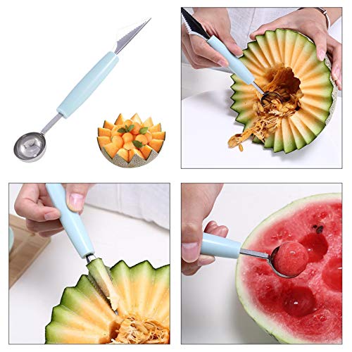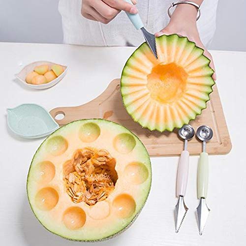 [Breed gebruik]: de groentesnijder kan worden gebruikt in keukens, huizen, restaurants, bakkerijen, feestpicknicks, feestelijke feesten, diners, enz. De ene kant van de graaflepel kan worden gebruikt om fruit of ijs te graven, zoals watermeloen en kantaloupe; aan de andere kant kunnen meloenen en fruit worden gesneden en artistiek gecreëerd.