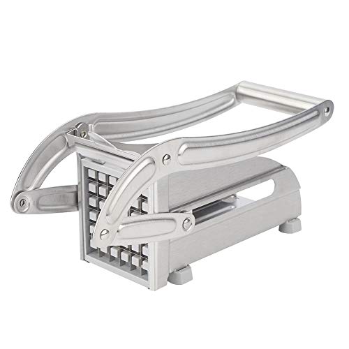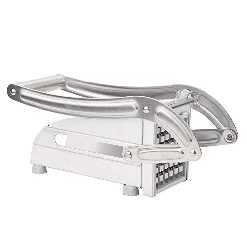 Met deze praktische aardappelchipsnijder maak je thuis gemakkelijk lekkere huisgemaakte frietjes. Hij snijdt aardappel in enkele seconden in frites, wat het snijwerk niet alleen veilig maakt, maar ook moeiteloos. De groentesnijder is gemaakt van hoogwaardig roestvrij staal materiaal, makkelijk af te spoelen en schoon te maken na elk gebruik. De antislip rubberen voetjes zorgen ervoor dat de aardappelsnijder niet rondschuift op je aanrecht tijdens het snijden van aardappel. Met twee verwisselbare snijmessen, het mes met 36 gaten is perfect voor steaks en het mes met 64 gaten is perfect voor hamburgers.