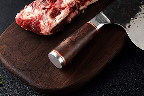 Multifunctioneel gebruik: dit mes kan worden gebruikt voor snijden, snijden, fijnmaken en voor andere doeleinden. Gehumaniseerd ontwerp: tussen het handvat en het lemmet bevindt zich een lichtboogruimte, die het stroomverbruik tijdens het gebruik vermindert. Door het boogontwerp kunnen de handen tijdens het gebruik op en neer bewegen. Materiaal: het lemmet bestaat uit handgesmeed roestvrij staal, het lemmet is zeer scherp. Het lemmet neemt geleidelijke kleuren aan, zodat het mes niet eentonig lijkt.