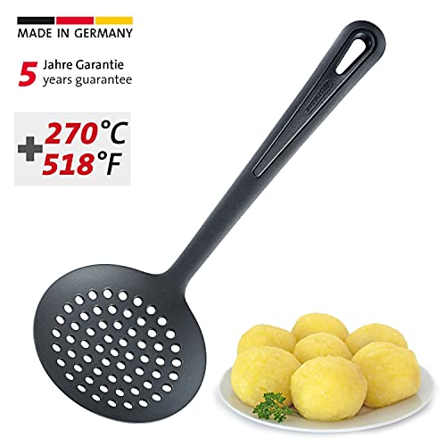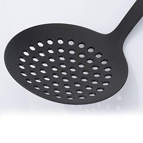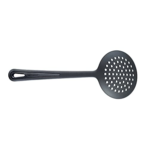 Geperforeerde schuimspaan van kunststof voor het afschuimen/laten uitlekken en opscheppen uit de pan of kookpot, hoge hittebestendigheid (270°C) voor gebruik in professionele keukens