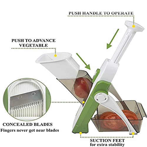 VEILIG TE GEBRUIKEN: Snijd, dobbel, hak of julienne groenten door simpelweg op de terugspringende handgreep te drukken. De messen zijn allemaal verborgen voor uw uiterste veiligheid. Geen risico op handletsel zoals bij een mes of conventionele mandoline-snijmachine. Inclusief mesbeschermer voor extra veiligheid wanneer niet in gebruik.