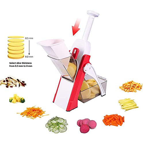 [UITSTEKENDE VEILIGHEID]: Snijd, snijd, hak of julienne groenten door simpelweg op de terugspringende handgreep te drukken. De bladen zijn allemaal verborgen voor uw uiterste veiligheid. Geen risico op handletsel zoals bij een mes of conventionele mandolineschaaf. Bevat een mesbeschermer voor extra veiligheid wanneer deze niet in gebruik is. Voorzien van zuignappen voor extra stabiliteit tijdens gebruik.