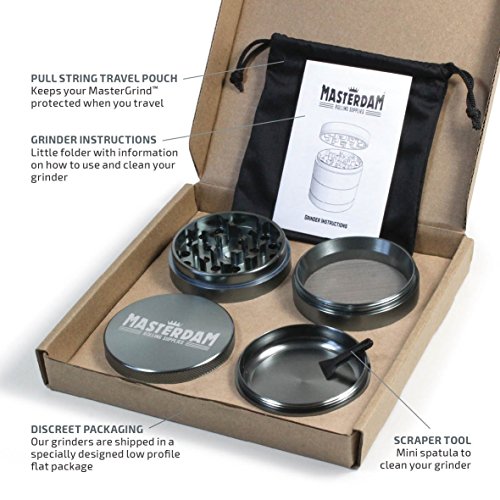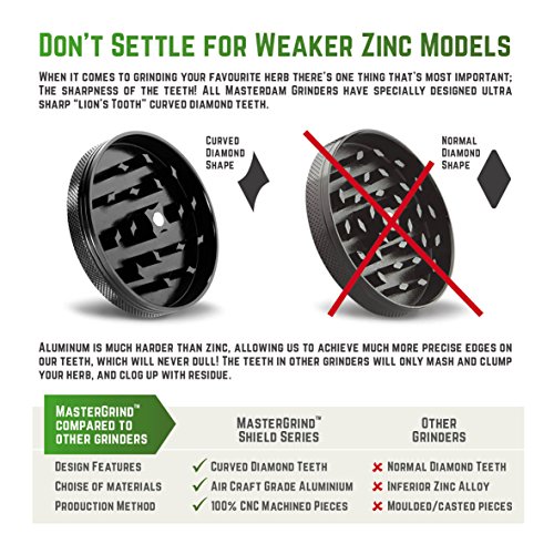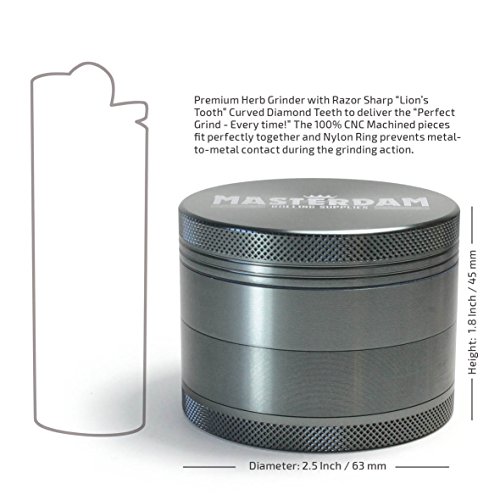 Superieure kwaliteit en DURABILTY – Precisie gefreesd 4-delig, 3-kamer slijpmachine gemaakt van geanodiseerd Aerospace Grade Aluminium met een super slanke, non-stick nylon O-ring voor zijdezacht slijpen; Onze 100% CNC bewerkte stukken passen perfect bij elkaar en nylon ring voorkomt metaal-naar-metaal contact bij het slijpen, voorkomen residu opbouwen en plakken in tegenstelling tot inferieure zinklegering S