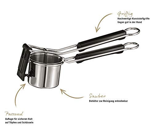Handzaam: Gemaakt van roestvrij staal 18/10 met hoogwaardige kunststof handgrepen, waardoor de aardappelpers steeds goed in de hand ligt – hygiënisch en neutraal van smaak.