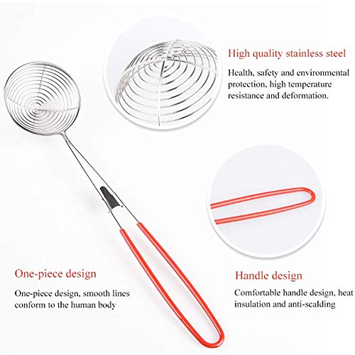 Breed scala aan toepassingen: het holle net vangt voedsel veilig op terwijl olie en en andere resten vrijkomen.Ideaal voor het frituren van chips, cakes, kippenpoten enzovoort.Lange handgreep om ons te beschermen, kan worden gebruikt in de keuken voor voedsel, groente, fruit , handvat, pasta, vergiet, friteuse, afdruiprek, yoghurt, draad, gaas, lepel, mand, koken, salade, noodle.