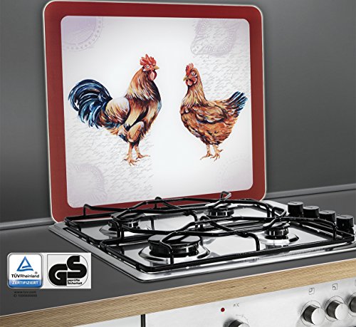 Kraan en kip brengen op de afdekplaat boerderij de landelijke stijl in de keuken. De multiplaat met het trendy landelijke motief kan verschillend worden gebruikt: of het nu als werkblad of wandpaneel is, als reuze-snijplank of mobiel werkblad (56 x 50 cm). De grote glazen plank zorgt voor een goed humeur.