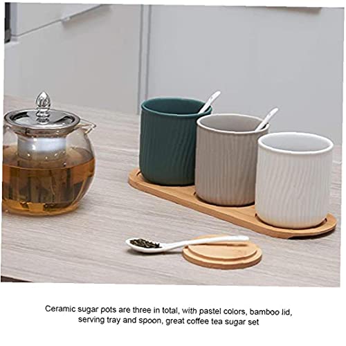 Keramische suikerpotten zijn drie in totaal, met pastelkleuren, bamboe-deksel, dienblad en lepel, geweldige koffie thee suiker set