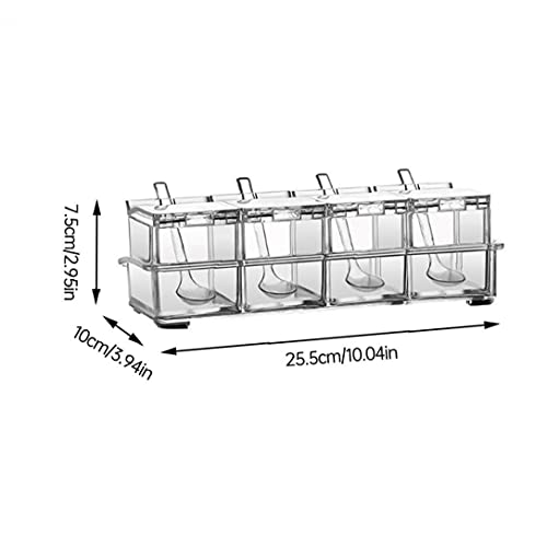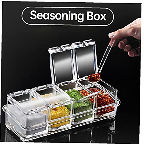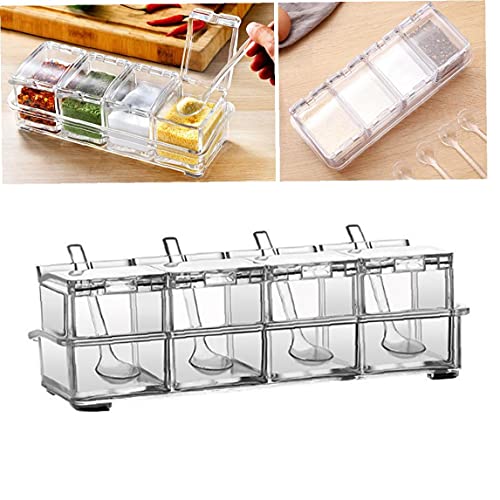 Kruidendoos met 4 cellen, covers en lepels is ideaal voor het vasthouden van kruiden, suiker, zout, peper en andere kruiden. Kruidenopslagcontainer met transparant ontwerp stelt u in staat om te zien welke smaakmakers in de keuken verkrijgbaar zijn door te kijken naar elke cel.